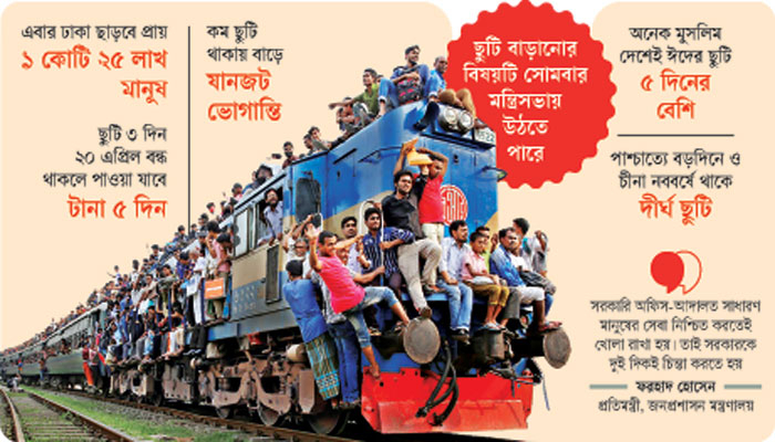 এ পটভূমিতে সরকারি-বেসরকারি বিভিন্ন মহল থেকে ঈদের ছুটি বাড়ানোর দাবি উঠলেও এ ব্যাপারে এখনও সিদ্ধান্ত নেয়নি সরকার। ফলে এবার ঈদযাত্রা নিয়ে কপালে চিন্তার ভাঁজ পড়েছে সবার। ছুটি তিন দিন থাকলে বেশিরভাগ কর্মজীবীর বাড়ি আসা-যাওয়া করতেই কার্যত সময়টা ফুরাবে। বাড়তি ছুটি না পেলে মাটি হবে তাদের ঈদ আনন্দ। আর বাস্তবিক কারণে ঈদে বেশিরভাগ কর্মীই বাড়তি ছুটি পান না। ফলে ঈদের সময় নির্বাহী আদেশে অতিরিক্ত ছুটির দাবি দীর্ঘদিনের হলেও এ নিয়ে সরকার কোনো সিদ্ধান্ত নিচ্ছে না।