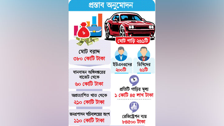সংশ্লিষ্ট সূত্রগুলো জানায়, প্রতিটি গাড়ির মূল্য ধরা হয়েছে এক কোটি ৪৫ লাখ টাকা এবং রেজিস্ট্রেশন ফি ৮০ হাজার ৫শ টাকা। এ হিসাবে একটি গাড়ি কিনতে মোট ব্যয় হবে এক কোটি ৪৫ লাখ ৮৪ হাজার ৫শ টাকা। এর আগে জনপ্রশাসন মন্ত্রণালয় থেকে গাড়ি চেয়ে অর্থ বিভাগে প্রস্তাব দেওয়া হয়। সেখানে কতগুলো যুক্তি তুলে ধরে বলা হয়, ডিসি এবং ইউএনওদের জন্য ২৬১টি গাড়ি কেনা দরকার।