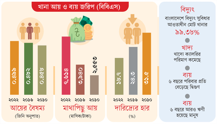 জরিপের তথ্য বলছে, গত ছয় বছরে খানার এবং মাথাপিছু আয় বেড়েছে দ্বিগুণের বেশি।
