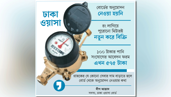 সরেজমিন আসাদ গেট সংলগ্ন ঢাকা ওয়াসার মিটার বিক্রয়কেন্দ্রে গিয়ে দেখা যায়, সংশ্লিষ্ট কর্মকর্তা মিটারের নতুন দামের চার্ট টেবিলের কাচের নিচে রেখেছেন। নাম প্রকাশ না করার শর্তে তিনি বলেন, ডলারের দাম বেড়ে যাওয়ায় কয়েক মাস আগে দাম বাড়ানো হয়েছে। ডলারের দর বাড়ার কথা বলা হলেও বর্তমানে যে মিটার সরবরাহ করা হচ্ছে তা ২০২০ ও ২০২১ সালে আমদানি করা। তখন দেশে ডলার সংকট ছিল না। পেপকো বাংলাদেশ লিমিটেড নামের একটি ঠিকাদারি প্রতিষ্ঠান দীর্ঘদিন ধরে ঢাকা ওয়াসায় এই মিটার সরবরাহ করে আসছে। অভিযোগ আছে, ওয়াসার সঙ্গে যোগসাজশ করে চীন থেকে নিম্নমানের মিটার আমদানি করে তা ওয়াসাকে গছিয়ে দেয় পেপকো বাংলাদেশ। ফলে এসব মিটারে সহসা সমস্যা দেখা দেওয়ার পাশাপাশি গ্রাহকের বিল বেশি আসতে শুরু করে। এ জন্য ঘন ঘন মিটার বদলের প্রয়োজন পড়ছে গ্রাহকের। এ ব্যাপারে পেপকো বাংলাদেশ লিমিটেডের স্বত্বাধিকারী মনিরুল ইসলাম বলেন, ‘যা জানার ওয়াসার কাছ থেকে জানেন। আমার বিজনেসের সিক্রেসি তো আর আপনাকে বলব না।’ আবেদন ফরমের দাম বাড়ল পাঁচ গুণ