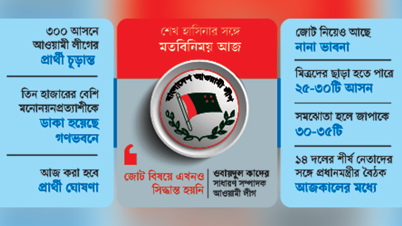 আজ রোববার ১৪ দলীয় জোটের শরিক দলগুলোর শীর্ষ নেতাদের সঙ্গে আওয়ামী লীগ সভাপতি শেখ হাসিনার বৈঠকের প্রস্তুতিও রয়েছে। গণভবনে সকাল থেকে শুরু দলের মনোনয়নপ্রত্যাশীদের সঙ্গে মতবিনিময় শেষ করে সময় দিতে পারলে আজই এই বৈঠক হতে পারে। অন্যথায় আগামীকাল সোমবার জোট শরিকদের সঙ্গে বৈঠকটি হতে পারে।