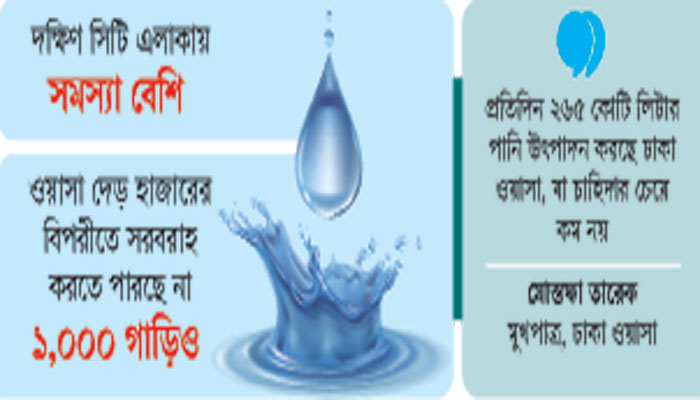 ঢাকা ওয়াসার এক কর্মকর্তা নাম প্রকাশ না করার শর্তে জানান, প্রতিদিন শত শত মানুষ ঢাকা ওয়াসার কল সেন্টারে গাড়িতে করে পানি সরবরাহ করার চাহিদার কথা জানাচ্ছেন। সেই চাহিদা অনুযায়ী পানি দিতে পারছে না ওয়াসা। প্রতিদিন গড়ে দেড় হাজার গাড়ি চাহিদার বিপরীতে ১ হাজারেরও কম গাড়ি পানি দিতে পারছে। বাকি গ্রাহকরা পানি থেকে বঞ্চিত থাকছেন। কারণ হিসেবে ওই কর্মকর্তা বলেন, পানির স্তর নিচে নেমে যাওয়া, লোডশেডিং ও জেনারেটরের স্বল্পতার কারণে পানি উৎপাদন কমে গেছে। অথচ উৎপাদনের ৬৬ শতাংশ পানি আসে ডিপ টিউবওয়েল থেকে। এ জন্যই পানির সংকট তৈরি হয়েছে।